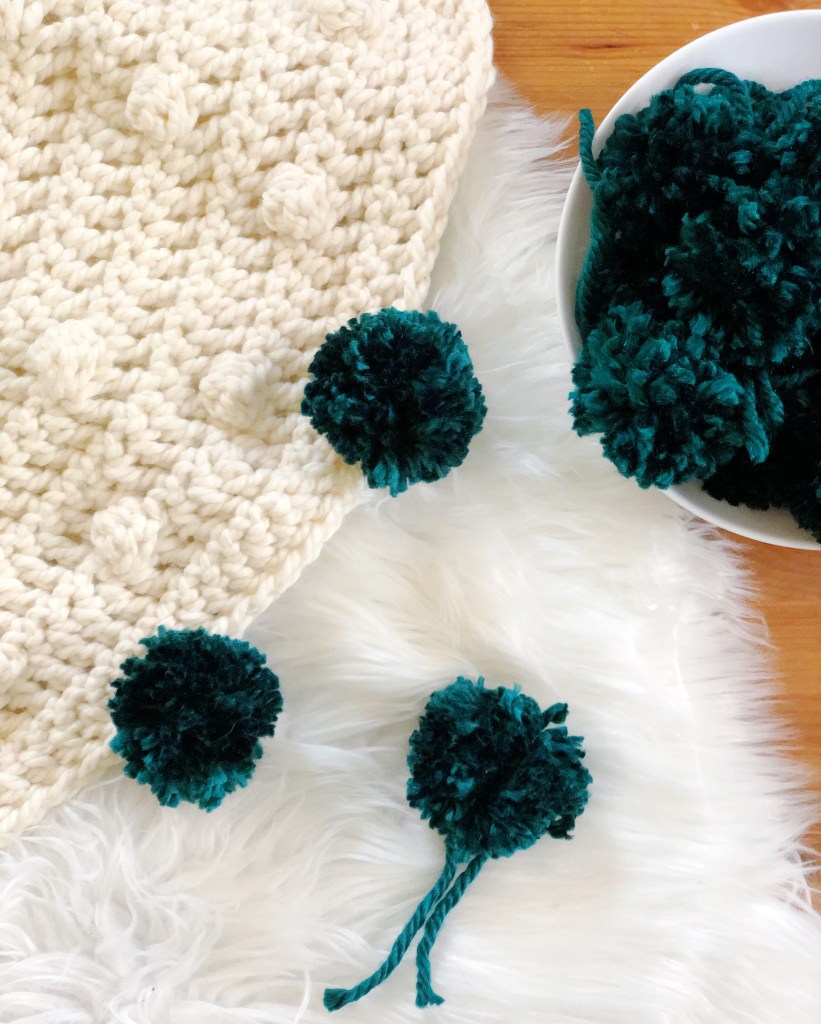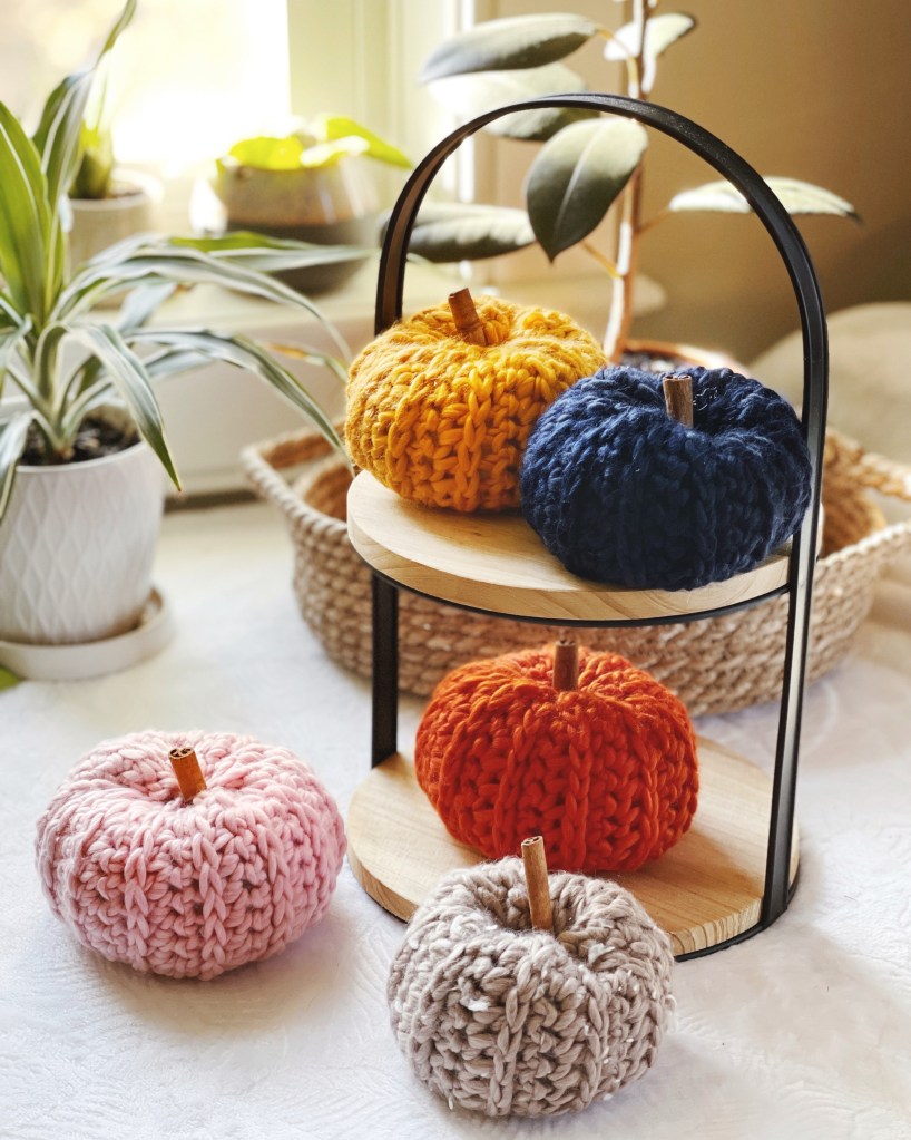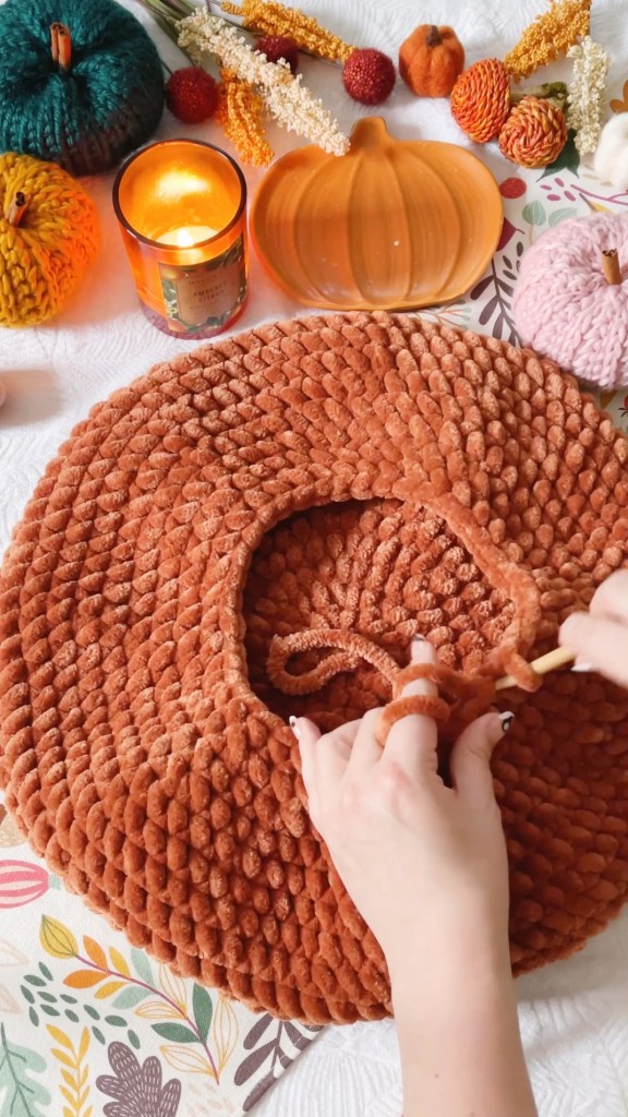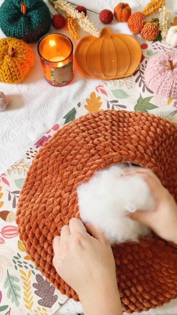 *Tip: to get a dip in the top of the pumpkin, after weaving the hole closed pull tail through the middle of the pumpkin until it comes out the bottom. Tie the tail to the bottom center in a way that isn’t noticeable, then push tail back into cushion and cut off any remaining tail.