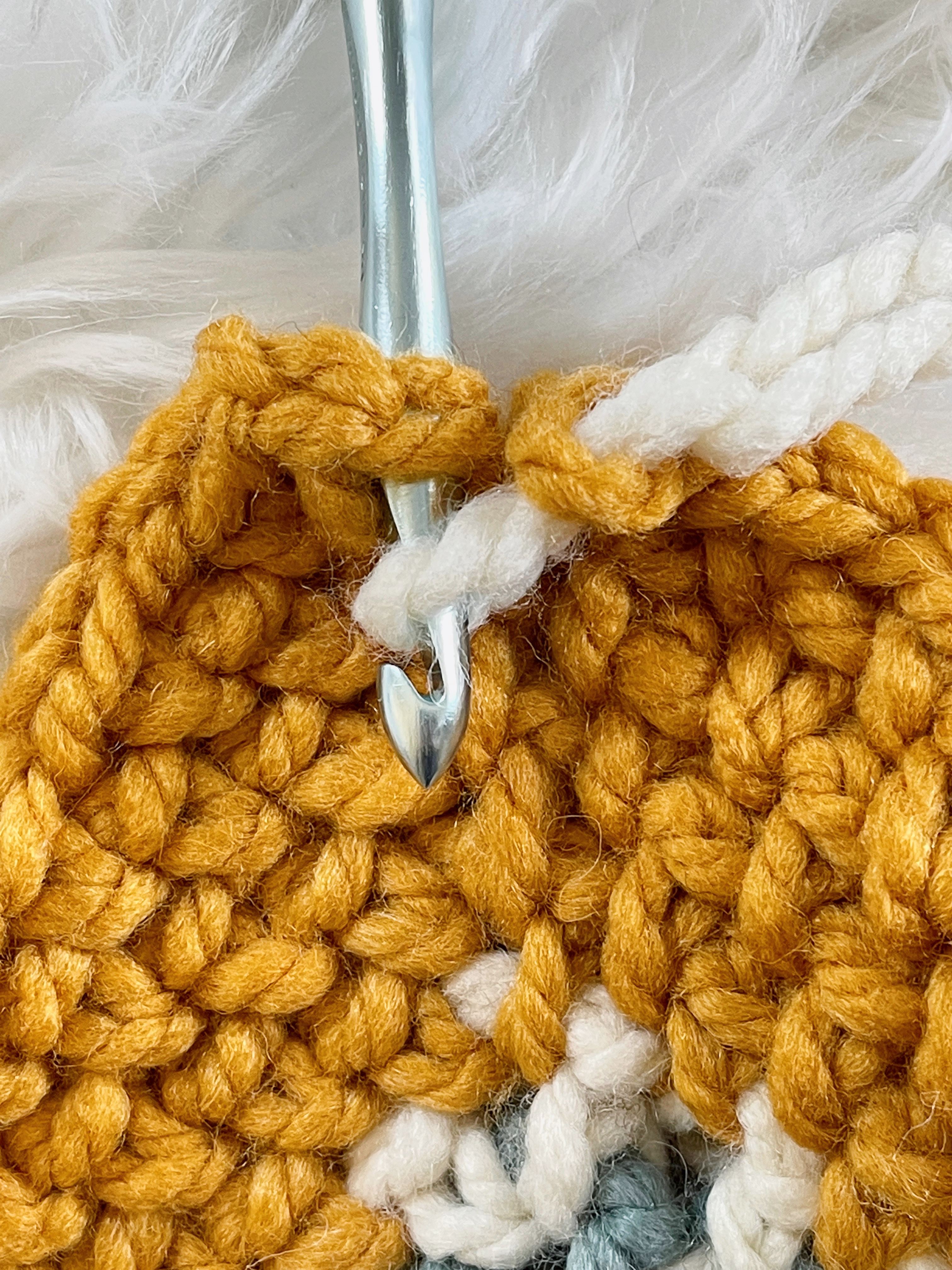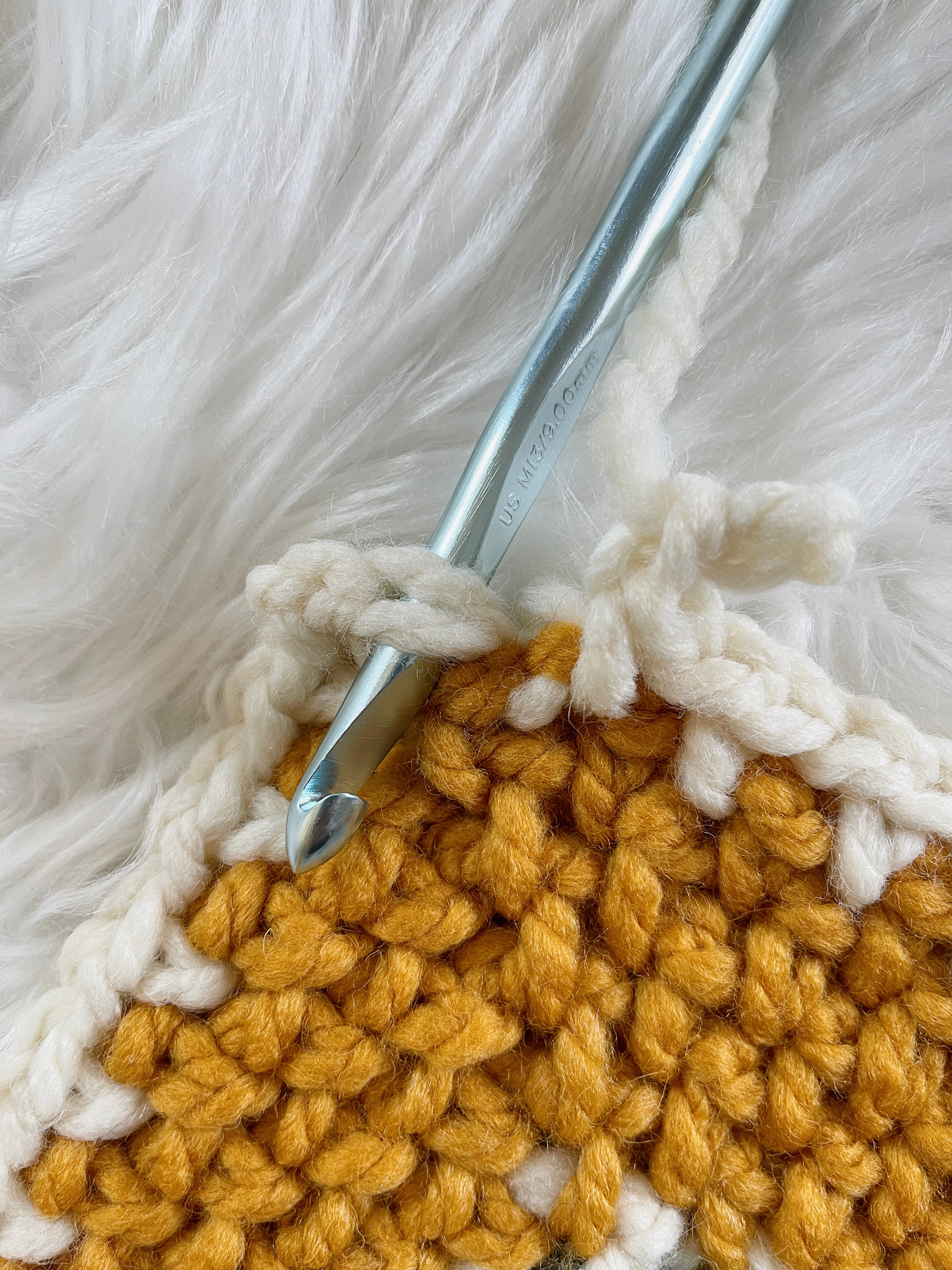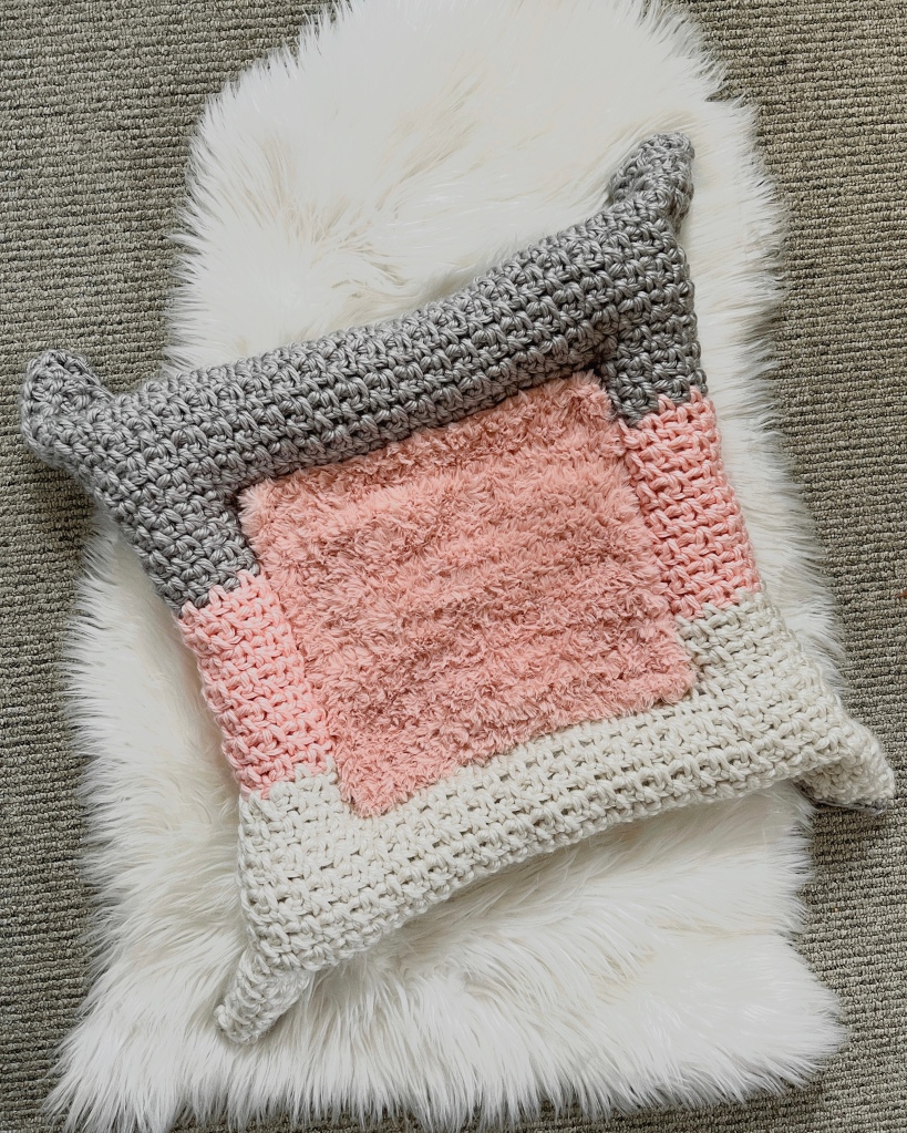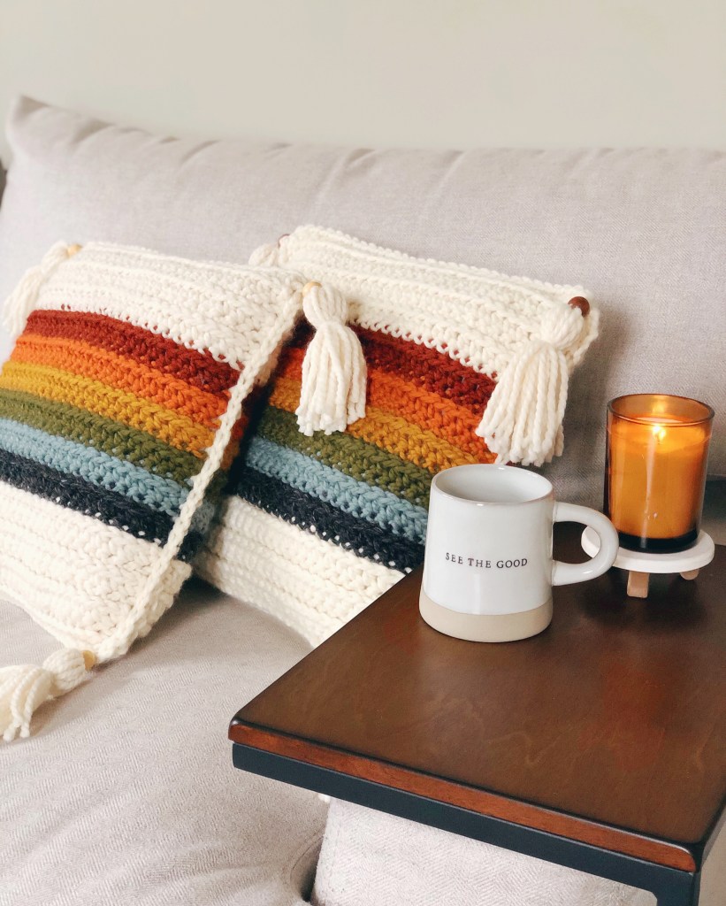 I used Chenille Home yarn from Michaels, and I highly recommend this yarn for this project, and any pillow project! The ends can be pretty sheddy, but once it’s worked up it feels so soft and squishy, but also pretty high-end and like a pillow you could buy at Target 😉.
