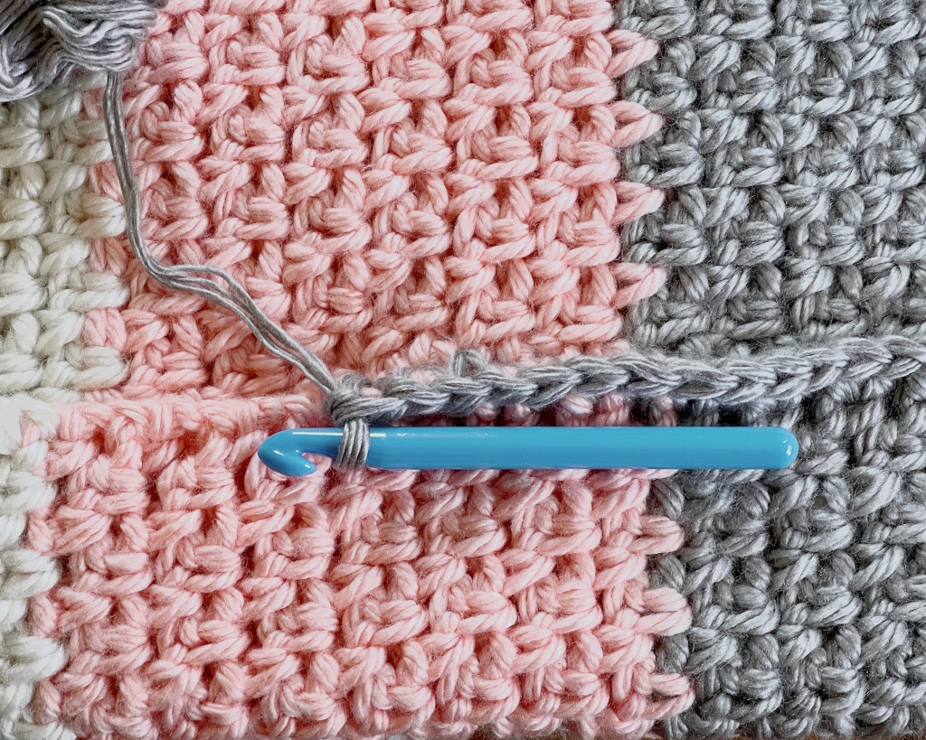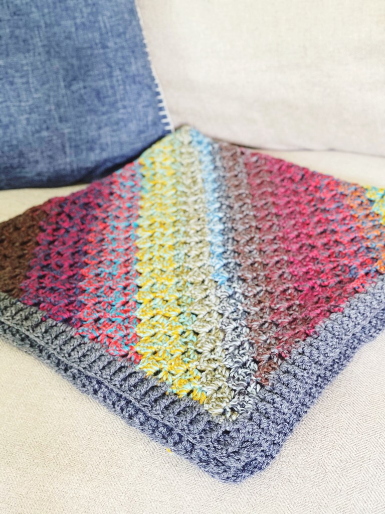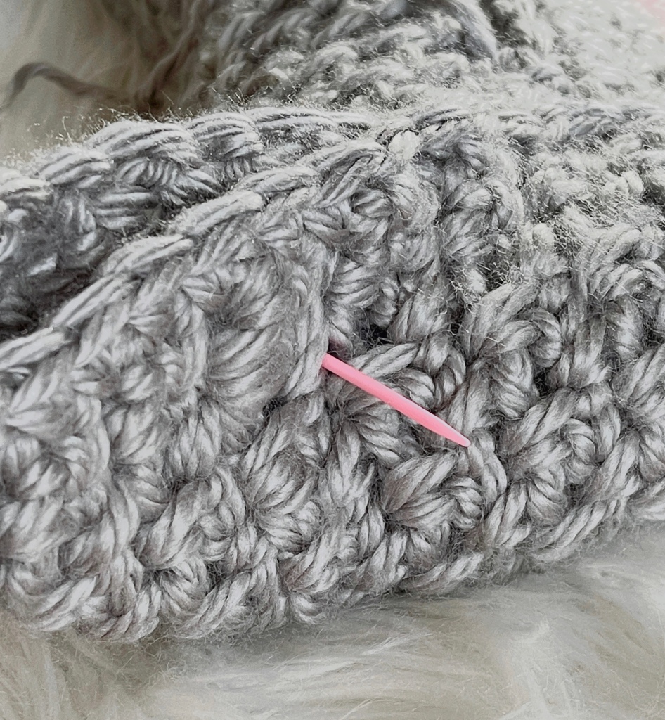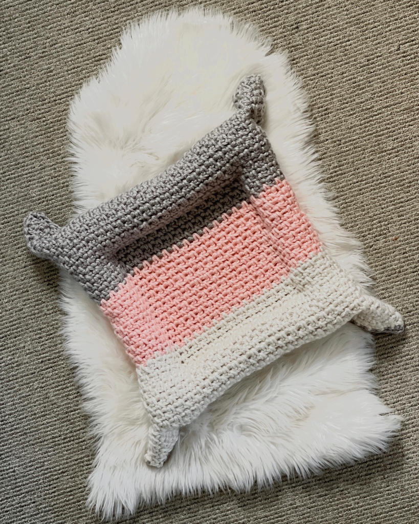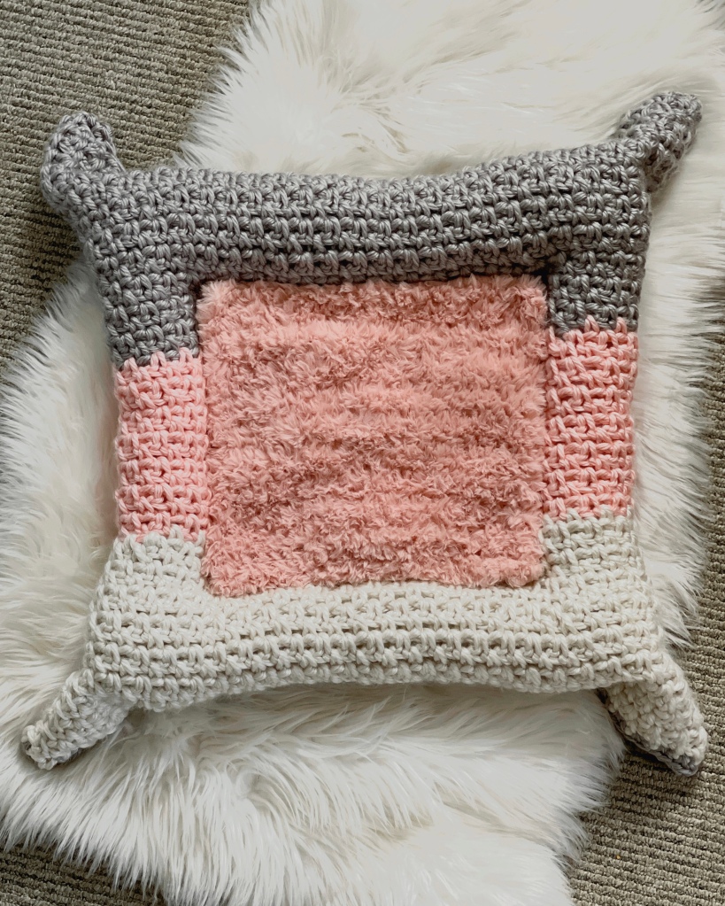 Leave long tail and attached to the top of the cushion using a whip stitch around. Weave in ends and enjoy!