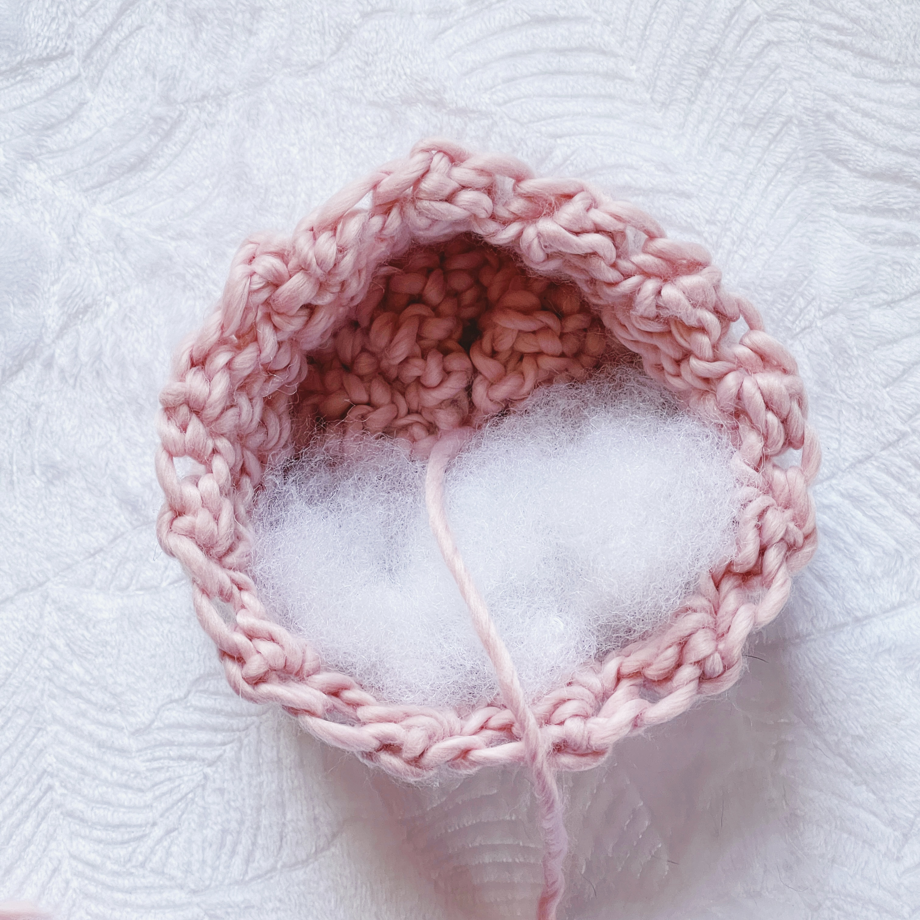 Stuff with additional stuffing if needed. Detach yarn, leaving a long yarn tail and weave through each ST with sewing needle to close hole*. Tie off, continue to stem.